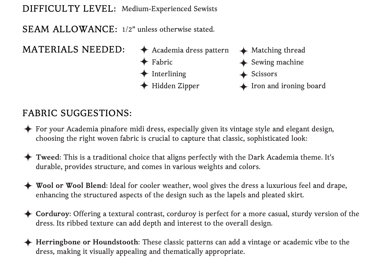 Introducing the "Academia" Dress Sewing Pattern – your portal to a world of enchantment and style. Drawing inspiration from the evocative corridors of magical schools and the cozy, scholarly aesthetic of Dark Academia, this pinafore midi dress is designed to weave a touch of mystery and classic charm into your wardrobe.