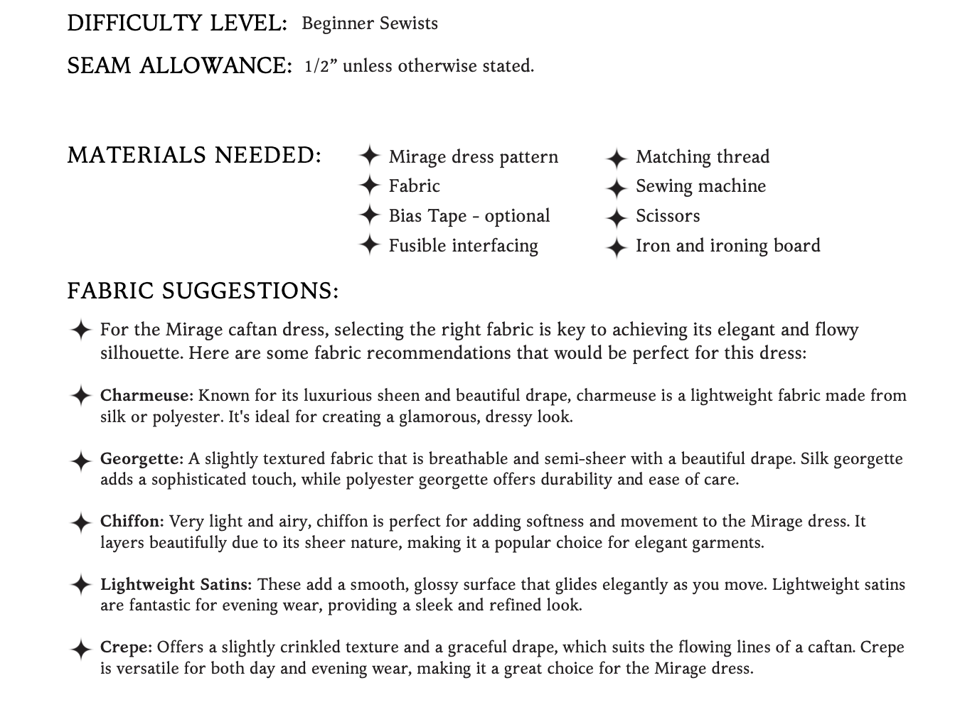 This pattern is ideally suited for woven fabrics like charmeuse, georgette, chiffon, and lightweight satins, which enhance the dress’s fluidity and dramatic flair. Whether you're lounging by the pool or enjoying a sunset dinner, Mirage ensures you do so in impeccable style.