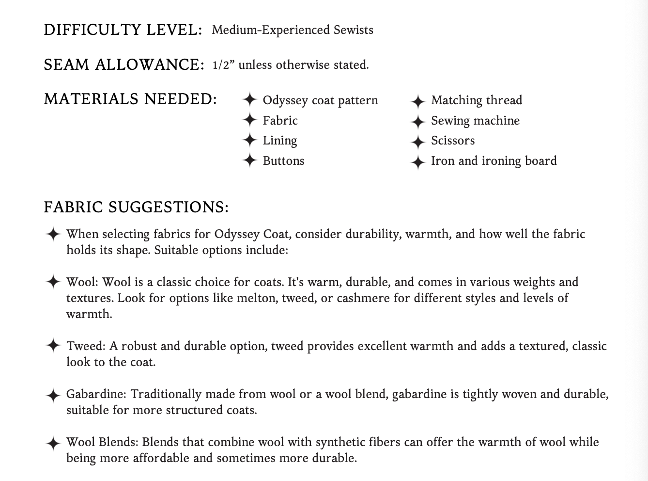 The inclusion of side pockets adds practicality without compromising the coat's sleek lines, offering a perfect blend of form and function. The design is completed with a lapel collar, adding a touch of classic charm to this contemporary piece. Whether you're looking to create a statement piece for your wardrobe or a versatile coat for everyday elegance, the Odyssey Coat sewing pattern is your canvas for creativity and style.