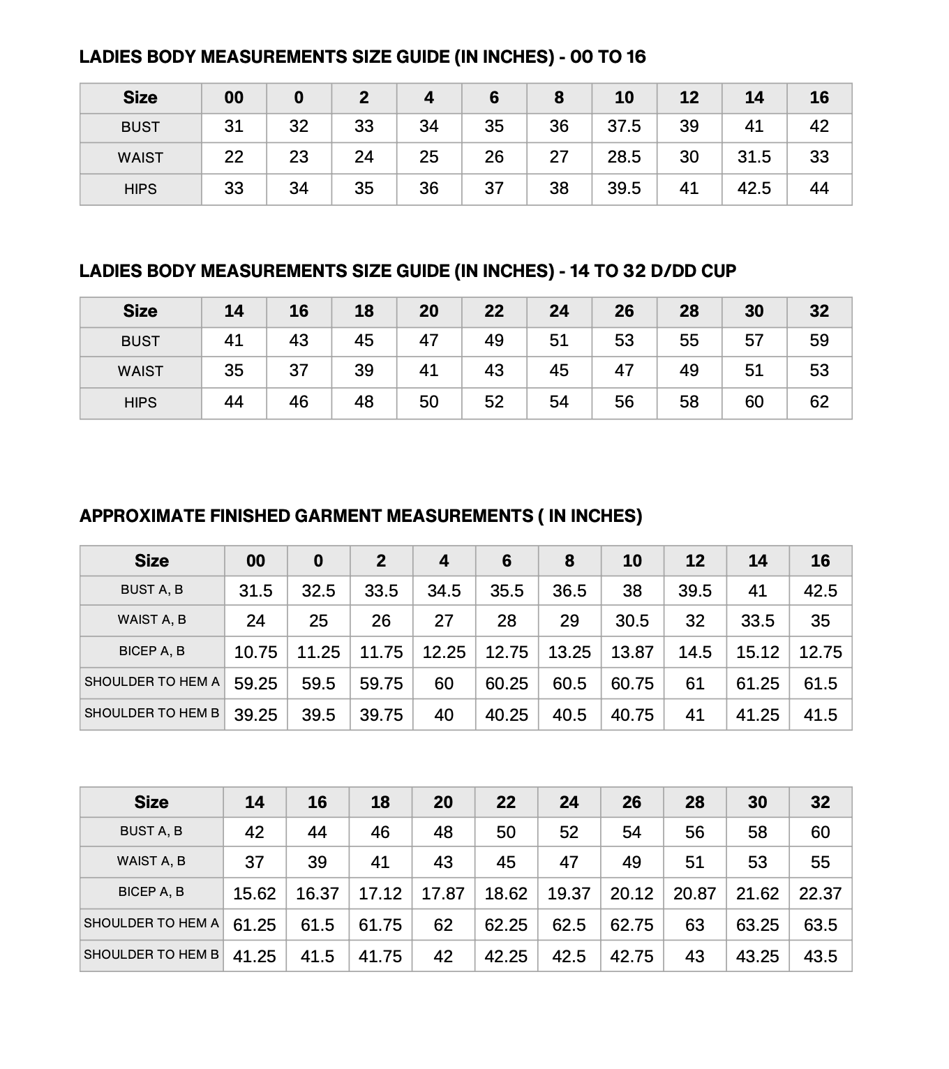 Size Charts, and Finished Garment Measurements