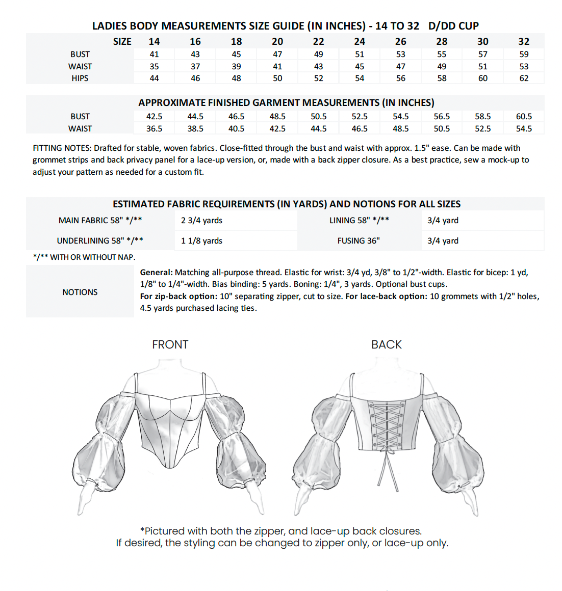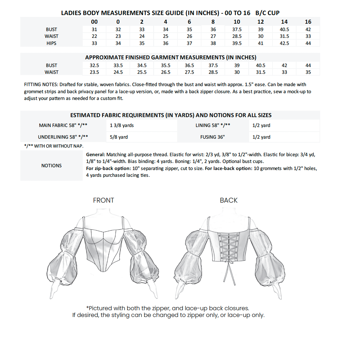The Renaissance Bustier sewing pattern captures the romantic, dramatic style of period-inspired fashion, perfect for costumes, festivals, and statement looks. Designed with voluminous off-the-shoulder puff sleeves, optional supportive straps, and a lace-up back placket, this beginner-friendly pattern offers both adjustability and flair. Ideal for sewists looking to create a bold, cinematic bustier, it’s a versatile project that can be customized to match your personal style or special occasion.