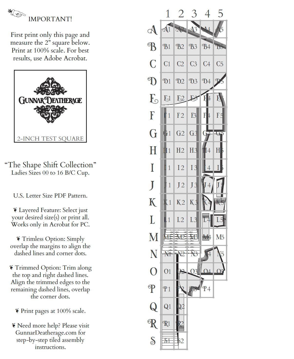 The file will be tiled, and is best printed from Adobe Acrobat. Make sure files are printed at actual size. There will be a test square for you to check sizing on the front page. The pages will then be taped together with either the bullseye, or diamond motif depending on which pattern is purchased