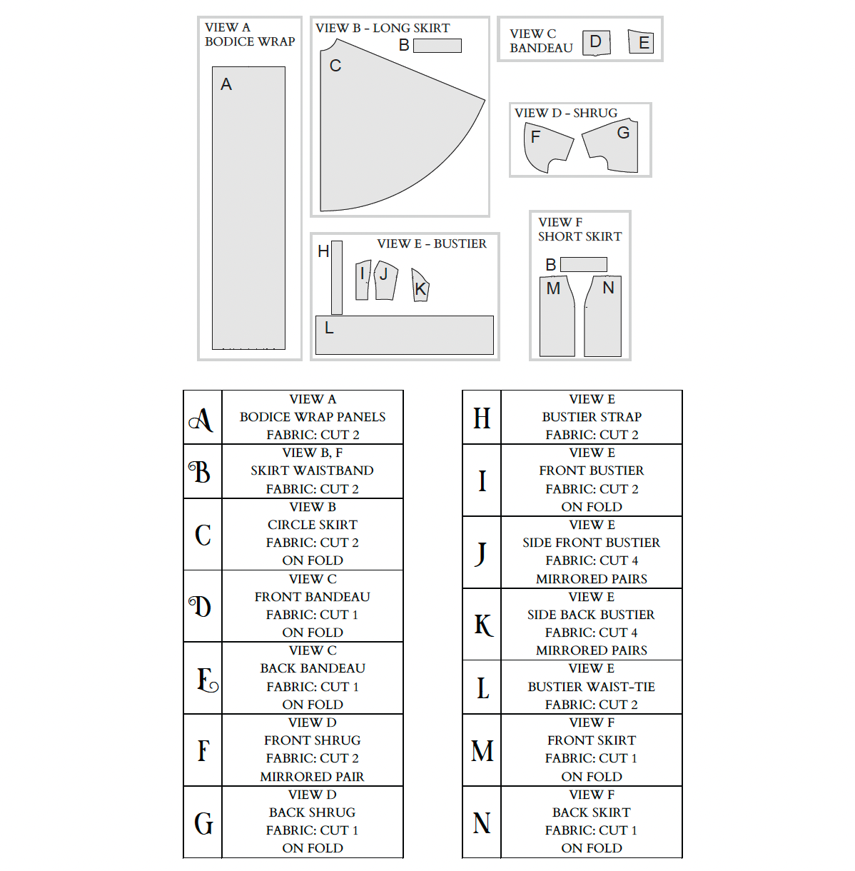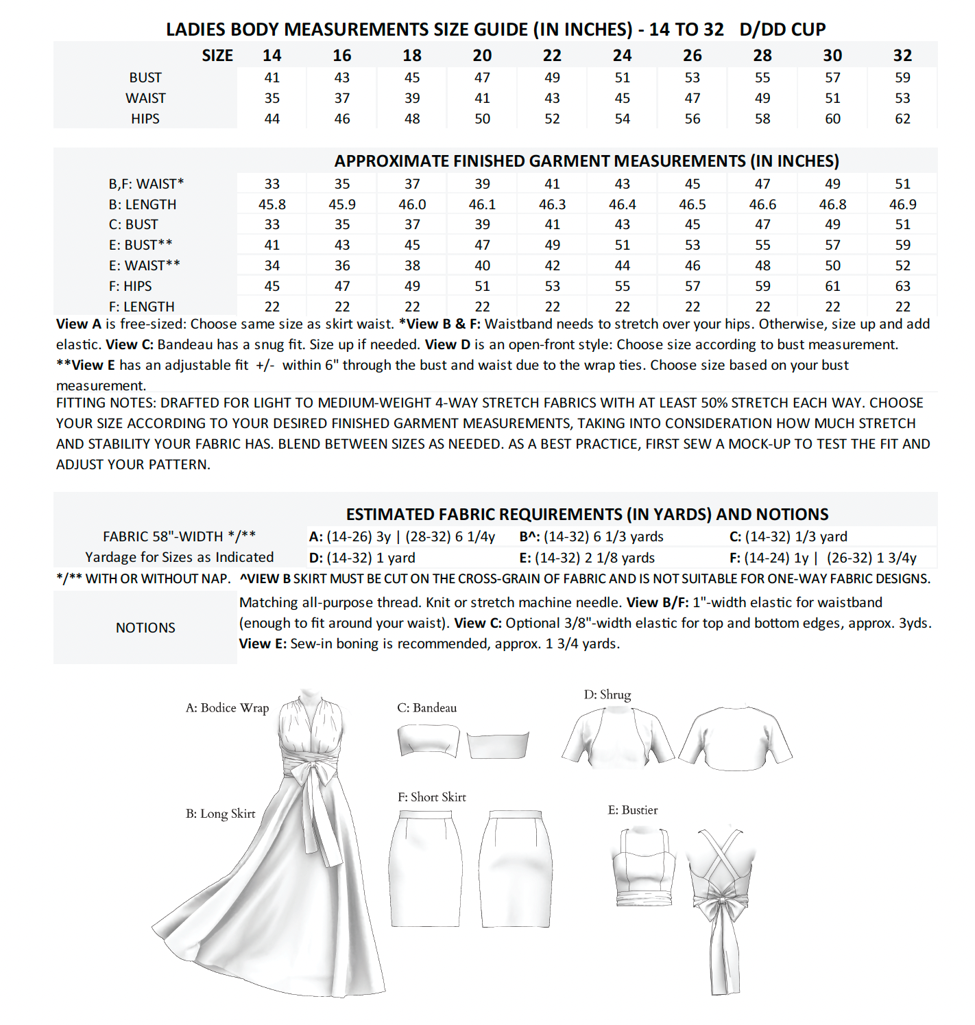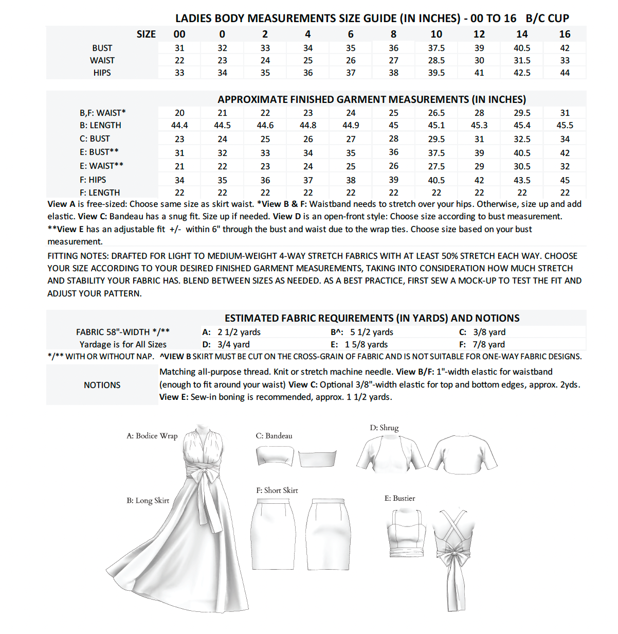 Four-way stretch fabrics are a must for this fabric. The ties on the bodice are drafted to be pulled and tied, so the stretch is necesssary.