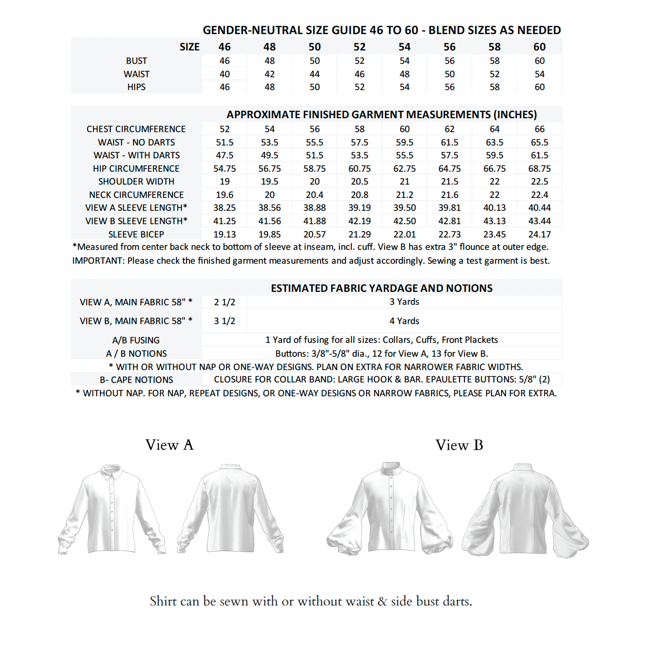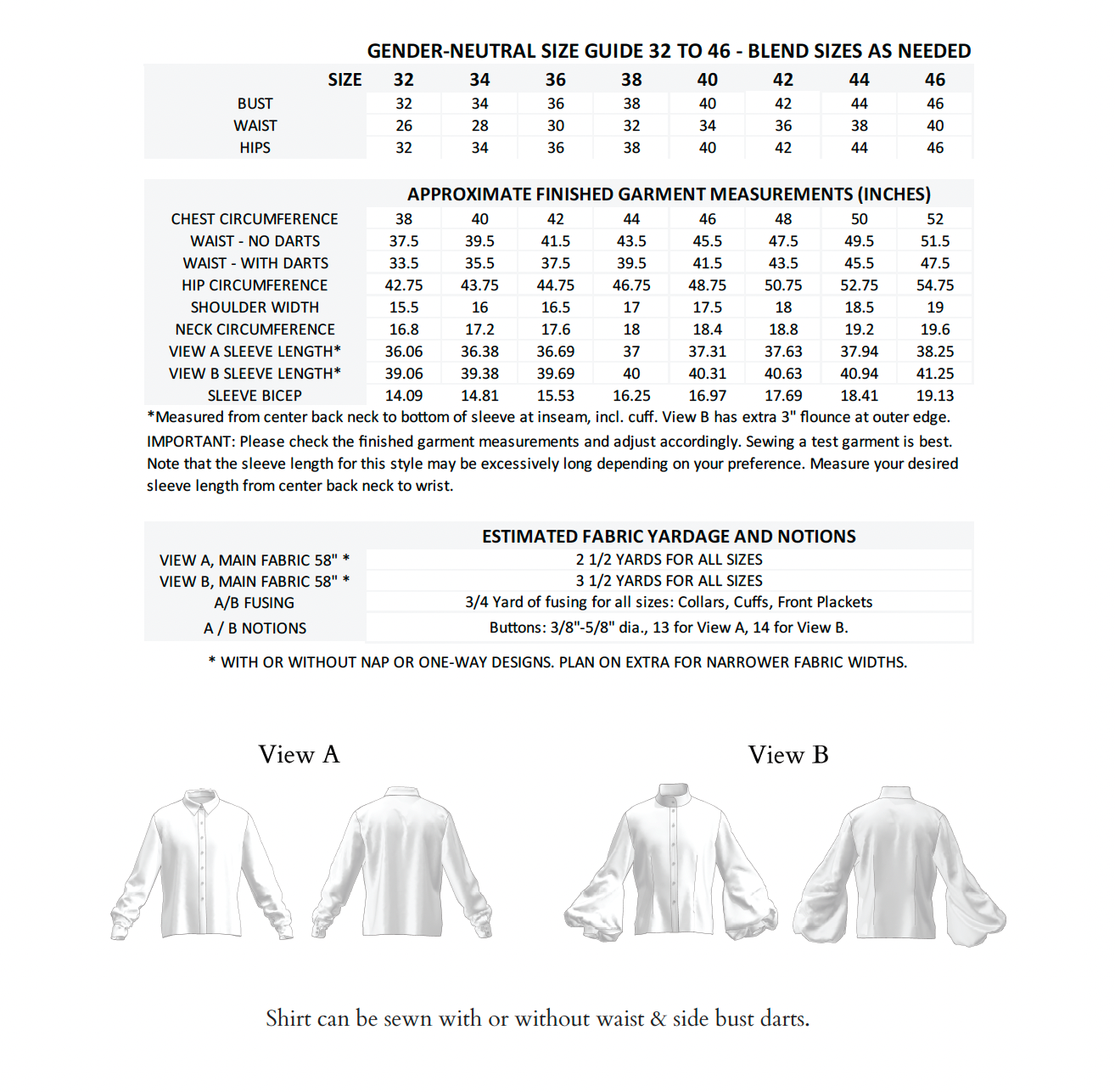 The Star Crossed Shirt sewing pattern is a unisex design that blends timeless style with versatile details, making it perfect for a wide range of wardrobes. Featuring two collar options—a classic collar with a stand and a sleek mandarin collar—this pattern includes straight sleeves for a clean, everyday silhouette and elegant bishop sleeves for added drama. With options for a straight fit, waist darts, or bust darts, you can tailor the shape for any body type or style preference. Ideal for light to medium-weight wovens, this shirt is a customizable staple for work, weekends, or special occasions.