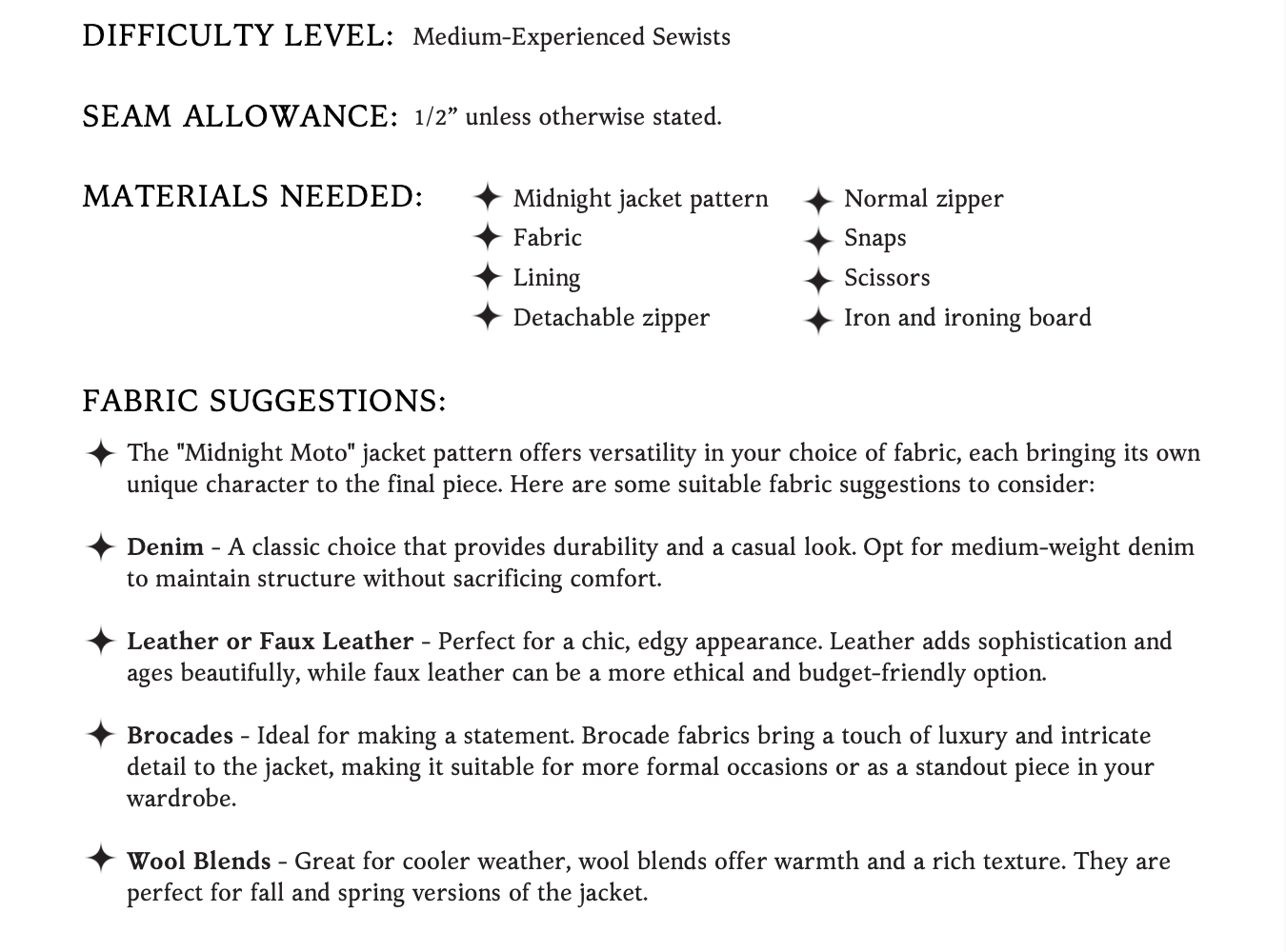 Welcome to the Midnight Jacket Tutorial! In this guide, we're diving into the world of Moto-jackets, a quintessential staple that I believe belongs in every wardrobe. What makes the Moto-jacket an indispensable piece is its flattering shape, versatile enough to be tailored from a variety of fabrics, each transforming its overall vibe. Whether you choose robust denim, classic leather, eco-friendly faux leather, sleek vinyl, or opulent brocades, this design accommodates fabrics with a sturdy hand that can handle a bit more weight.